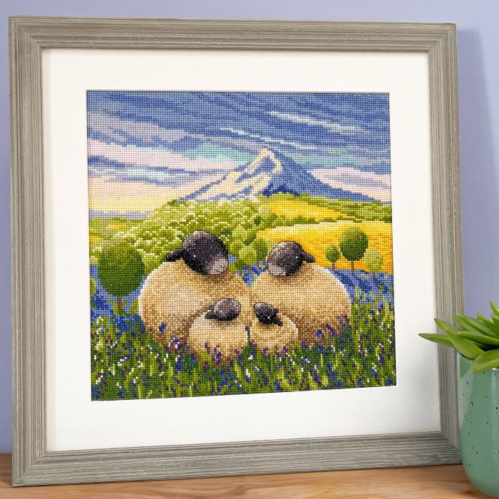 Bothy Threads Precious Moments Cross Stitch Kit by Lucy Pittaway is a modern art farm animal design featuring a Ewes and Lambs in a lush green field on a warm spring day, with colourful wildflowers and fabulous hillside views.