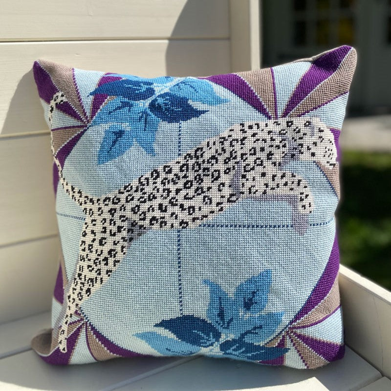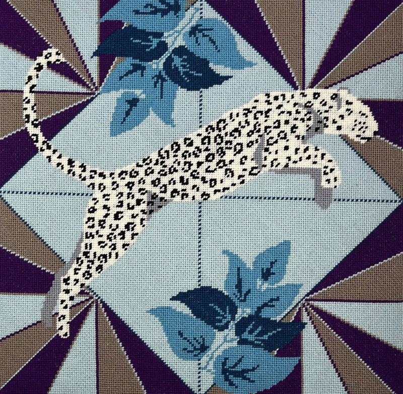 Appletons Vibrant Leopard Tapestry kit is a fantastic unique big cat tapestry project with a geometric background design, on colour printed 12 holes per inch canvas. Appletons Wools Animal Kingdom Collection by Thread and Mercury.